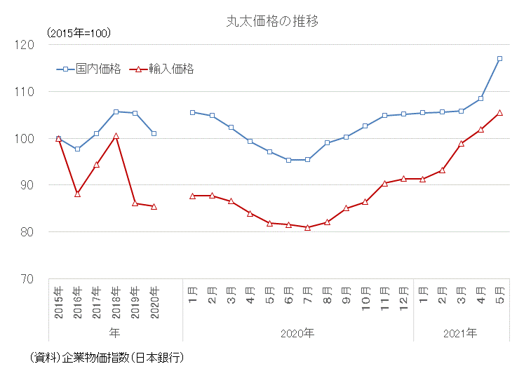 では、日本への影響はどうでしょう。上記の原因に影響されて、世界的に木材の価格は上昇し、2021年に入ってから丸太や製材の輸入価格も高くなりました。