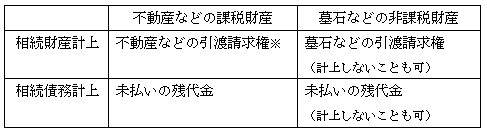 ①の場合、原則として未払い部分と引き渡しを受ける部分を両建てで計上する必要があります。しかし、墓石などは相続税が課されない「非課税財産」のため、引渡請求権を財産として計上せず、残代金においても債務として計上しない処理も可能です。※評価額は、原則として売買契約に基づく取得価額となります。ただし、不動産などを含む財産は、財産評価基本通達などに基づいて評価した価額で計上することも認められています。